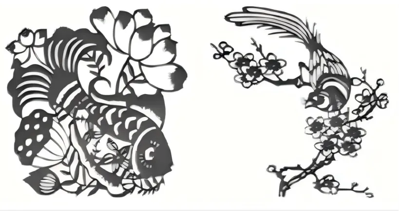 21. 剪纸是我国传统民间艺术,常用具体的形象表达纳福迎祥的寓意。请从下面剪纸画中任选一幅,说明其寓意,并从图画构成和谐音两方面进行简单解释。